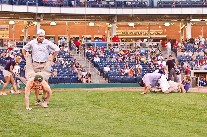 Last night we went to the Rockhounds game with friends for our good friend Luke’s birthday! {you know this made this baseball fan VERY EXCITED!} His wife Julie did a great job or organizing & getting us great seats and she even arranged for the guys to do the DIZZY BAT race after the bottom of the 4th. It was hilarious & I of coarse asked to go on the field with them to capture the moment.